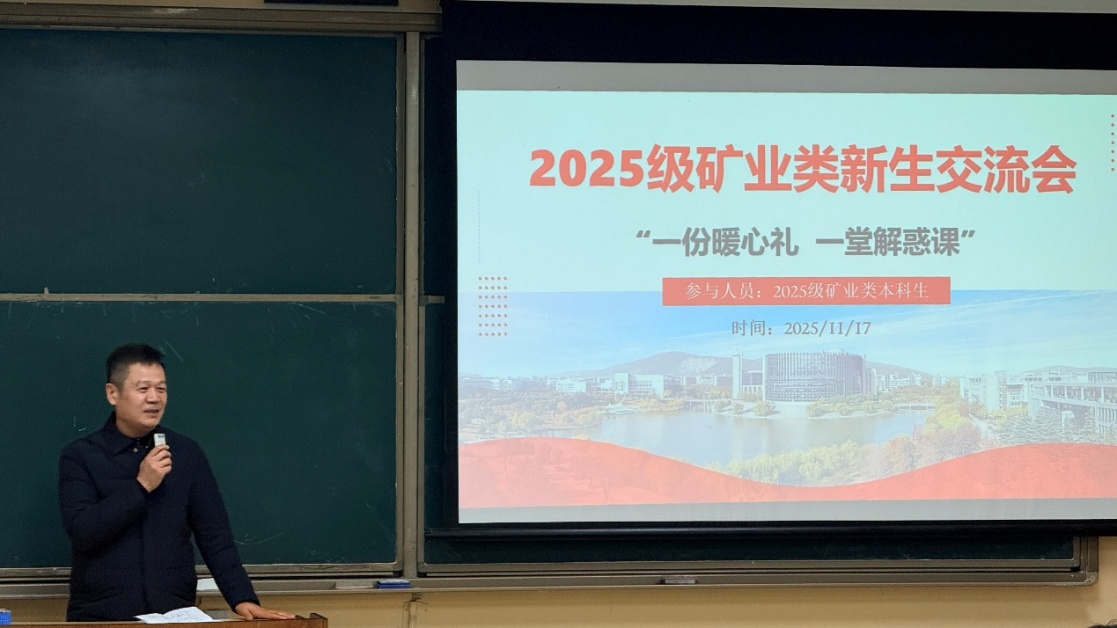 2025年11月17日晚,资环系为2025级矿业类新生精心策划了一场别开生面的新生交流会。学院党委书记周长春、资环系主任廖寅飞、副主任梁龙和何鑫、2025级班主任贺琼琼、刘铖、王海楠、王维楠及教师代表杨斌参加了活动。