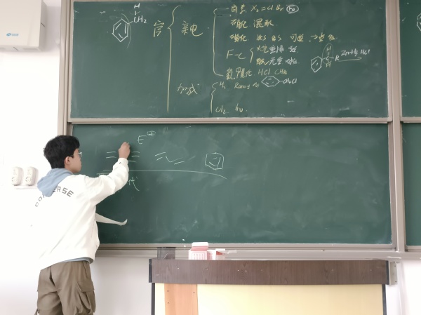 本次“学霸小课堂”的讲解内容分为三部分。首先,刘昱昊先带大家复习了有机化合物的命名方法,接着详细讲解了芳烃章节的主要知识点,绘制了复习思维导图,并对烯烃等章节简要归纳,提醒同学们有机化学知识要分类联系,找出共性与个性。随后,赵金柯从化合物能量最低出发,深入讲解了诱导效应、共轭效应等知识,系统讲解了各个官能团及其反应。最后,梁静老师对各个知识点的重点和难点作了补充。