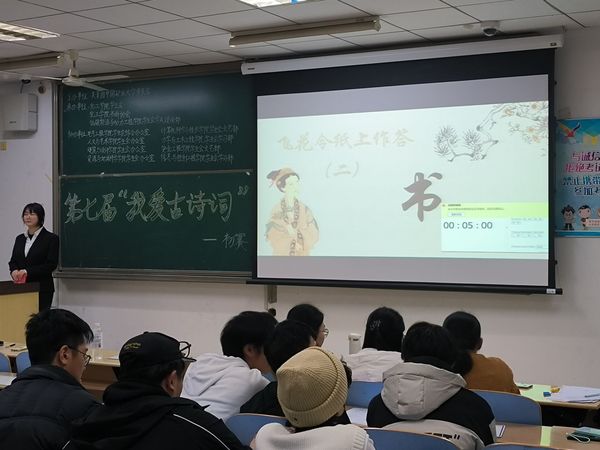 晚7时,活动正式开始,现场的大屏幕上播放着赛前同学投稿的诗朗诵视频,充分调动了现场的气氛。本次初赛共分为三个环节,采用积分制的方式进行比赛。第一环节是“火眼金睛”,选手们需要在2分钟从5*5或7*7的文字方格中寻找出一句正确的诗句。第二环节是“飞花令”,该环节一共两部分,一是文字书写飞花令,二是语言回答飞花令。参赛选手要依据主持人给定的字或词,书写或者回答出包含该字或词的正确诗句来获取积分,在此环节中参赛选手们各显神通,竞争异常激烈。比赛也由此进入高潮,一句句诗词交锋在一起,引起同学们阵阵热烈的掌声。经过激烈角逐,第二环节结束, 场上比分逐渐被拉开。 第三环节是文化常识,考验选手们的诗词文化积累及对诗词理解,选手们需在规定时间内完成纸质试卷作答,本环节也是此次初赛最重要的环节。晚9时,比赛正式结束,工作人员进行分数统计,并公布最进入决赛的选手名单。