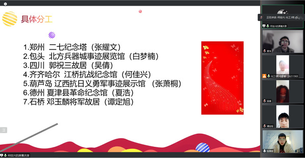 会议伊始,白梦楠向实践团成员们介绍本次社会实践的核心主题:以深入实地走访调研的方式,学习家乡红色文化,传承家乡红色基因,生动展现青年学生奋进新征程、建功新时代的心声和行动。会议中,白梦楠阐述了具体实践内容、实践形式以及实践方法。她指出,每个不同的地方都有许多感人至深鼓舞人心的红色故事,此次实地调研主要针对的就是各自家乡的红色文化。实践过程中,实践团全体成员实地走访家乡红色教育基地,用文字和影像的方式记录下了实践成果,并于之后的会议上进行分享。本次实践活动,让实践团成员了解了不同地区的红色文化和家乡的红色革命故事,追忆难以磨灭的峥嵘岁月,深切感悟革命先辈的伟大情怀和革命风范。会议最后,经实践团全体成员协商讨论,确定了河南省郑州市二七纪念塔、内蒙古自治区包头市北方兵器城、黑龙江省齐齐哈尔市江桥抗战纪念馆等七处作为本次寒假社会实践活动的红色实践基地。