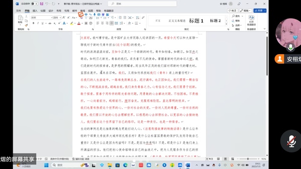 会议上,负责人安栩熠对团队内同学们提交的宣讲稿进行了点评,指出稿子的优缺点,并着重强调宣讲稿要把重点放在讲好青年故事上,要把人物背后的故事完整地讲出来;此外他还强调,宣讲稿的素材要反映时代精神,故事要与时俱进,让听众们对新时代青年的形象更加深刻。会议最后由团长付晨妍做出总结并提出下一阶段的主要任务。