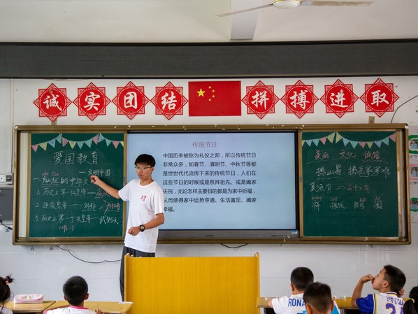 7月21日上午,梦启支教团在金沙县第九小学(金沙县彩虹小学)开展爱国教育主题课程。该课程由何佳兴老师主讲,授课对象为梦启二班全体同学。